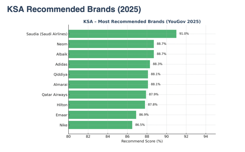 - Saudia: Top-recommended brand in Saudi Arabia (2025).
